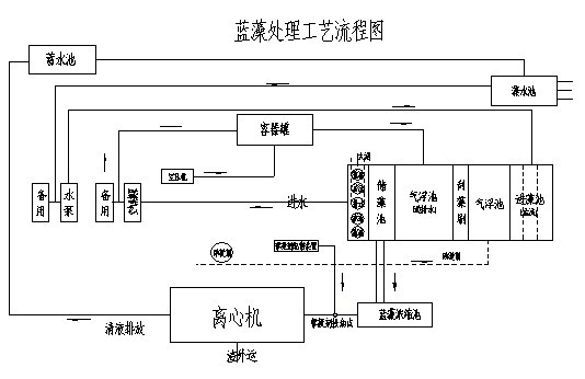 蓝藻由水泵从湖面抽至进藻池内,藻泥由进藻池溢流到气浮池,在气浮池内由空压机泵入气、水对气浮池内的藻泥进行搅动的同时,另一条管线泵入助凝剂进行助凝,经过助凝和气浮后的藻泥,由于比重较轻因此浮在池面上,这时通过刮藻刷把气浮池表面堆积的藻泥刮到储藻池,储藻池内上层藻泥溢流至蓝藻浓缩池,下部水通过管路排出进入容器罐,在蓝藻浓缩池经过浓缩后的藻泥通过与絮凝剂投加装置输送过来的絮凝剂进行絮凝后进入离心机进行分离后,分离后的渣相外运,液相排入湖面。