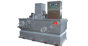 待处理的物料由进料泵提升进入进料系统,物料没有进入卧式螺旋卸料沉降离心机之前,加药系统的絮凝剂在储粉罐经计量喂料器进入制备罐配制0.1-0.3%的溶液,搅拌充分溶解后,进入第二个缓存罐。经缓冲罐慢速搅拌增加高分子链条,进入第三个使用罐,据工艺需要流量由变频加药螺杆泵经过流量计与待处理污泥混合,絮凝后进入离心机..