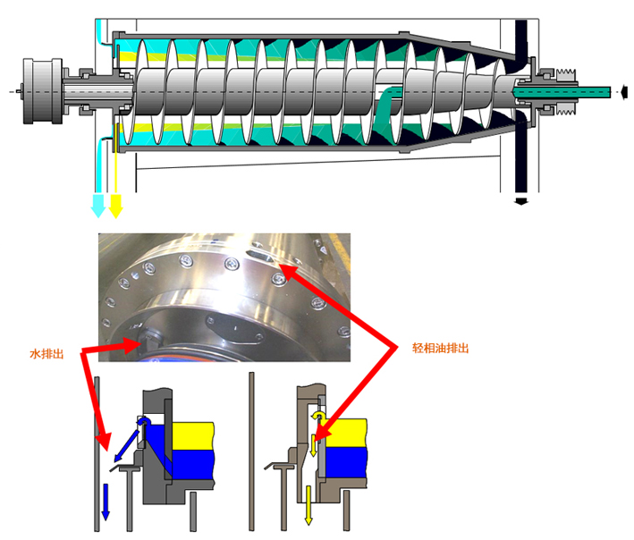 三相离心机结构主要由差速器,螺旋,转鼓、罩壳、机座、润滑系统、电机等部分组成。其工作原理是:悬浮液经进料管、螺旋出料口进入转鼓。在高速旋转产生的离心力作用下,比重较大的固相颗粒沉积在转鼓内壁上,与转鼓作相对运动的螺旋叶片不断地将沉积在转鼓内壁上的固相颗粒刮下并推出排渣口,不同比重的液相会在转鼓内形成两道液环,经大端盖的两个不同的出口流出。